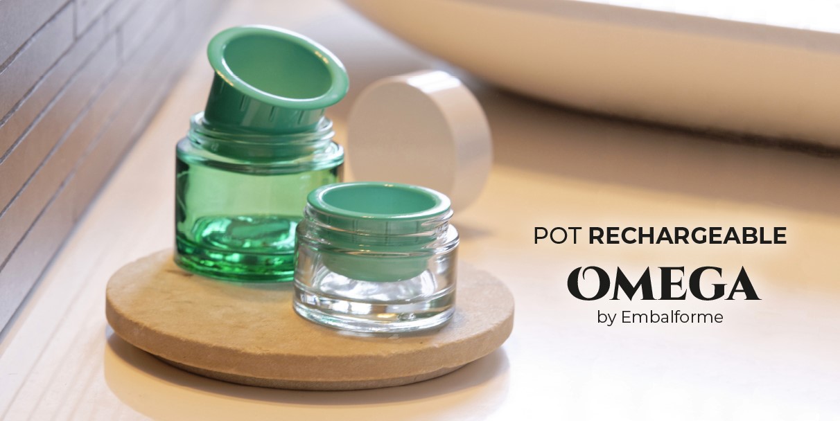 Omega is a PCR glass jar that incorporates a certifiable eco-refill made from bio-sourced materials derived from plants, 100% vegetable-based.